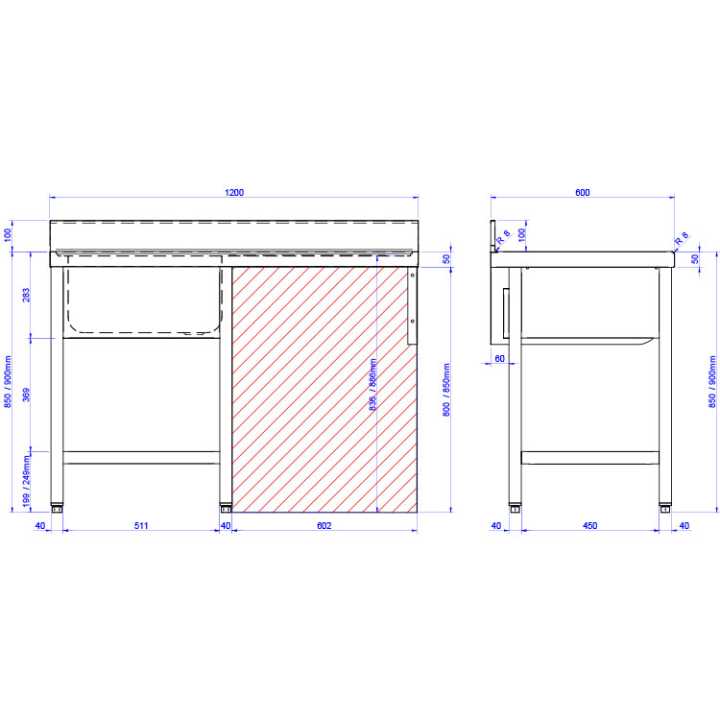 As mesas estão desenhadas para acomodar uma máquina de lavar louça de abertura frontal de 600 x 600 mm.