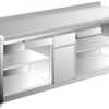 Tampo de trabalho em conformidade com as normas sanitárias mais rigorosas, fabricado com chapa de 1,2 mm de espessura e frente de 50 mm, reforçado com ômegas longitudinais.
