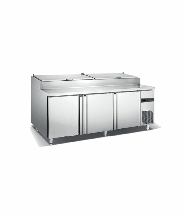 Mesa refrigerada para preparacão de pizzas, com estrutura exterior e interior em aço inox AISI201, 3 portas aço inox, pés em aço inox reguláveis em altura. Termostáto digital com controlo eletrónico da temperatura e descargas, sistema de refrigeração forçada e 1 prateleira por porta. Compartimento no tampo para containers de ingredientes e temperatura interior +2ºC a +8ºC.