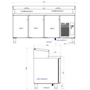 Recipiente neutro embutido na bancada para colocar ingredientes usando GN 1/3 de profundidade 150 mm ou GN 1/4 de profundidade 150 mm (não incluído)