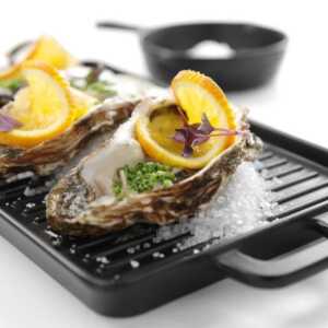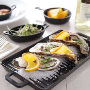 Tabuleiros e taças de apresentação em melamina, em formato de artigos de cozinha.
