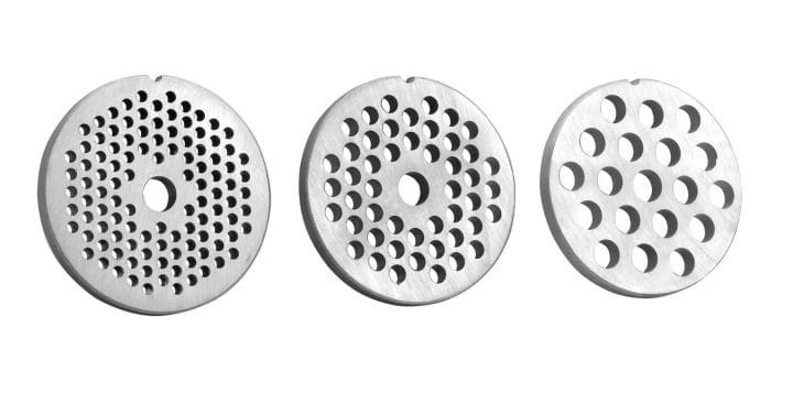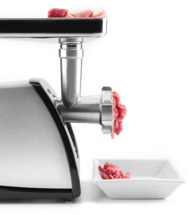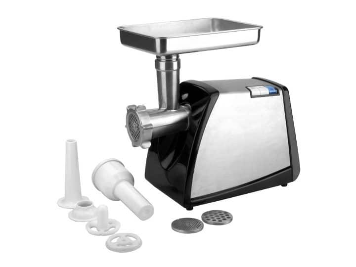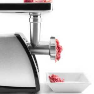 Moedor elétrico da carne modelo Home de 800 W com 3 discos intercambiáveis de aço inoxidável para fatiar em diferentes tamanhos.
