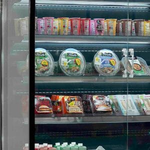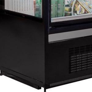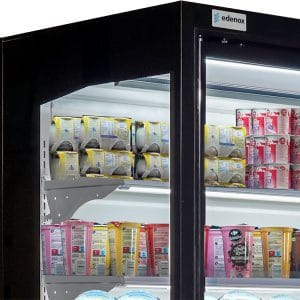 As paredes laterais são transparentes, com vidro de painel duplo, permitindo que os alimentos sejam exibidos de qualquer ângulo, capturando a atenção dos clientes enquanto caminham pela loja