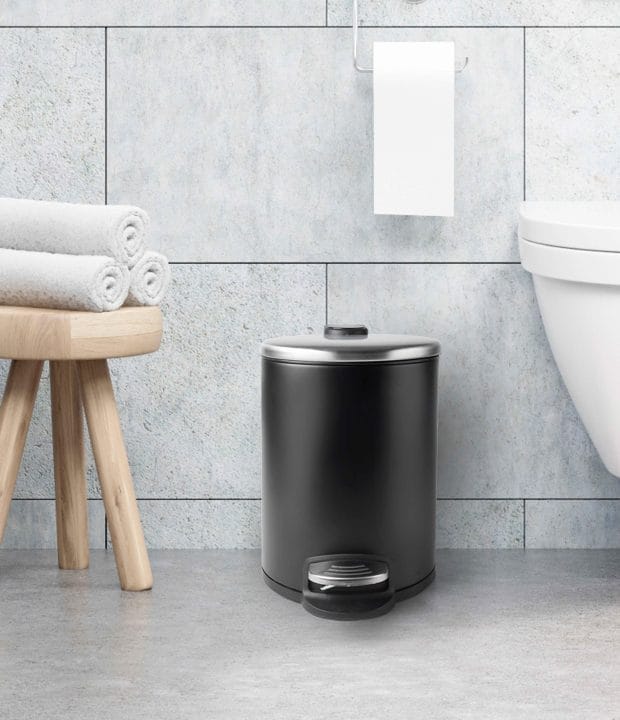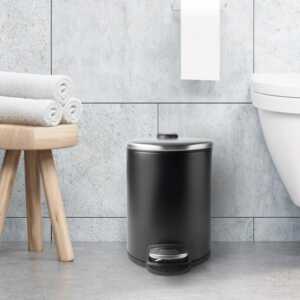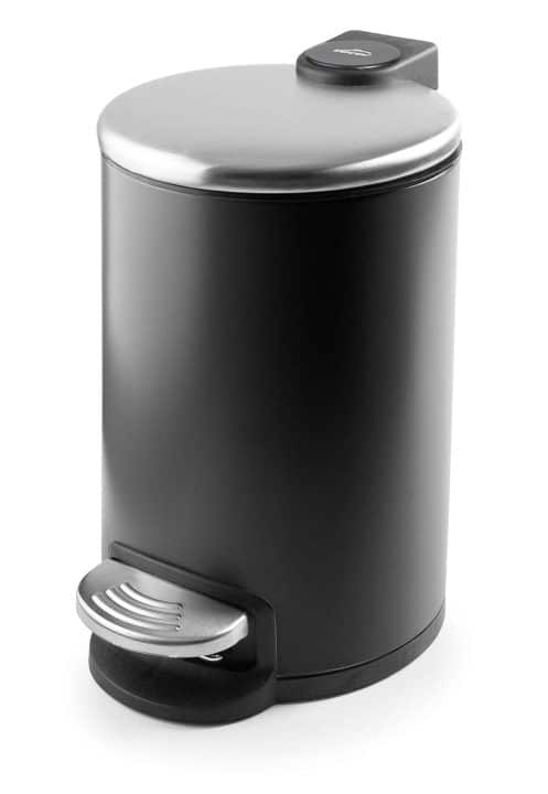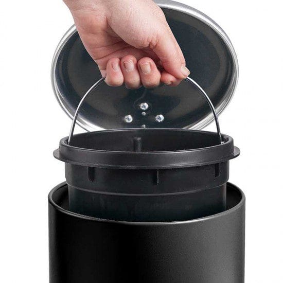 Papeleira de 3 litros em aço inoxidável cor preto com pedal de abertura da tampa e cuvete interior extraível de polipropileno com asa.