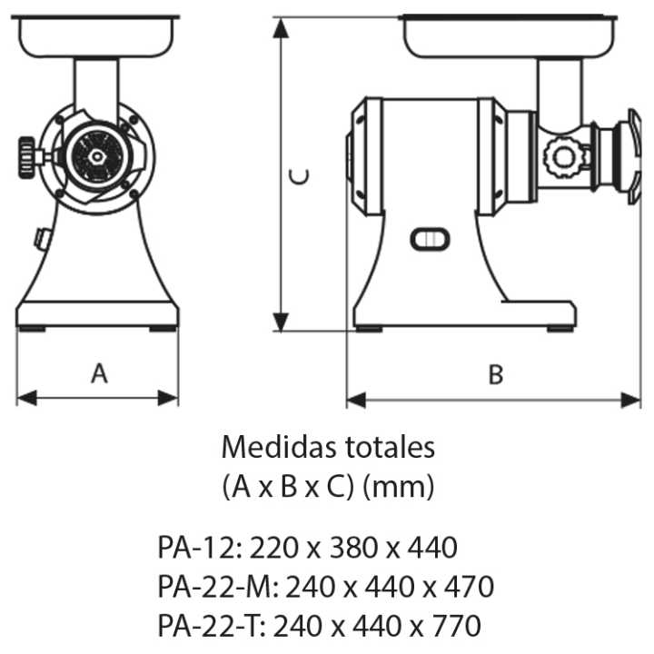 Nos modelos PA-12 e PA-22, o sem-fim de alimentação é feito de alumínio, enquanto a faca e a tigela são feitas de aço inoxidável.