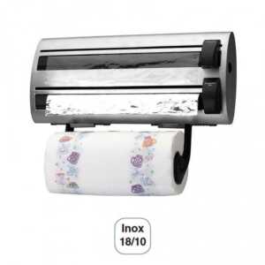 Porta-rolos de cozinha 3 em 1. para instalar na parede e dispensar papel de cozinha, filme transparente e papel de alumínio. É fabricado em aço inoxidável 18/10 de alta qualidade e resistência à corrosão.