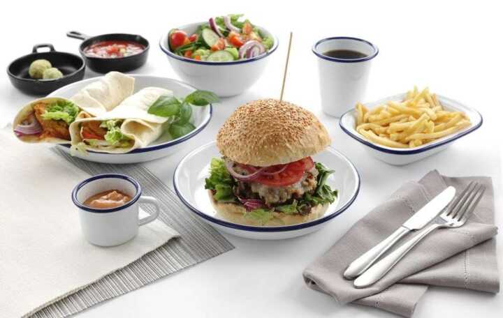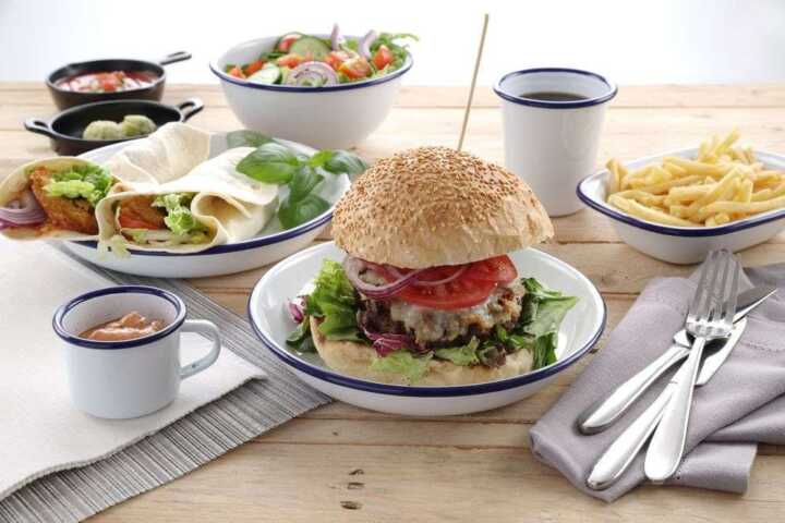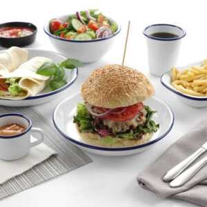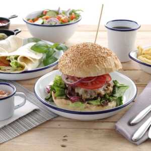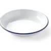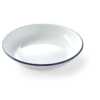Aço esmaltado em branco com um elegante rebordo em azul.
