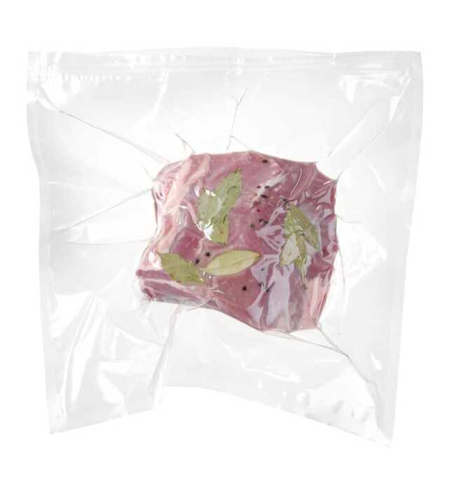 2 camadas, camada interior de 60 µm em polietileno aprovado para contacto alimentar, camada exterior de 15 µm em poliamida (nylon).