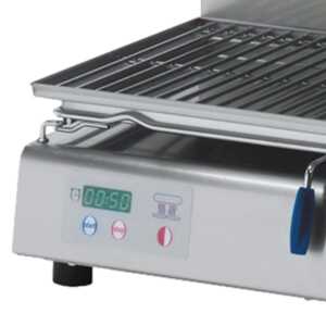 Parte superior móvel verticalmente com elemento de aquecimento permite grelhar pratos de diferentes tamanhos.