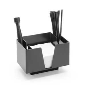 Mantenha os guardanapos, palhinhas e agitadores à mão. Este prático suporte de guardanapos tem 3 compartimentos para guardar muitos artigos essenciais de barra.