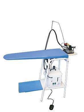 Mesa de passar semi-industrial com estrutura fixa. Forma em alumínio 109 x 43 cms com aquecimento eléctrico 400 W, motor de vácuo 75 W, gerador de vapor com caldeira em aço inox, estrutura pintada de branco. Capacidade de água 3,4 lts, volume de água 4,5 lts. Resistência 1450 W, pressão de vapor 2,8 – 3 BAR. Dupla válvula de