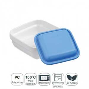 Bol quadrado de 12x12x4,5 cm, com tampa fabricado em policarbonato. Compatível com bandejas isolamento B1 destinadas à distribuição de refeições em hospitais, residências, etc.