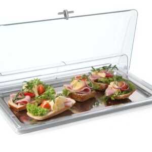 A capa de apresentação GN 1/1 feita de policarbonato transparente é um acessório para bandejas de banquetes GN.