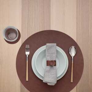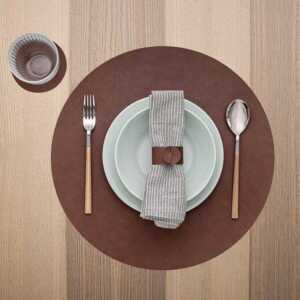 Individual redondo de 40 cm feito de couro liso marrom 100% reciclado com uma espessura de 1,5 mm, Higiênico e fácil de limpar com solução hidroalcoólica.
