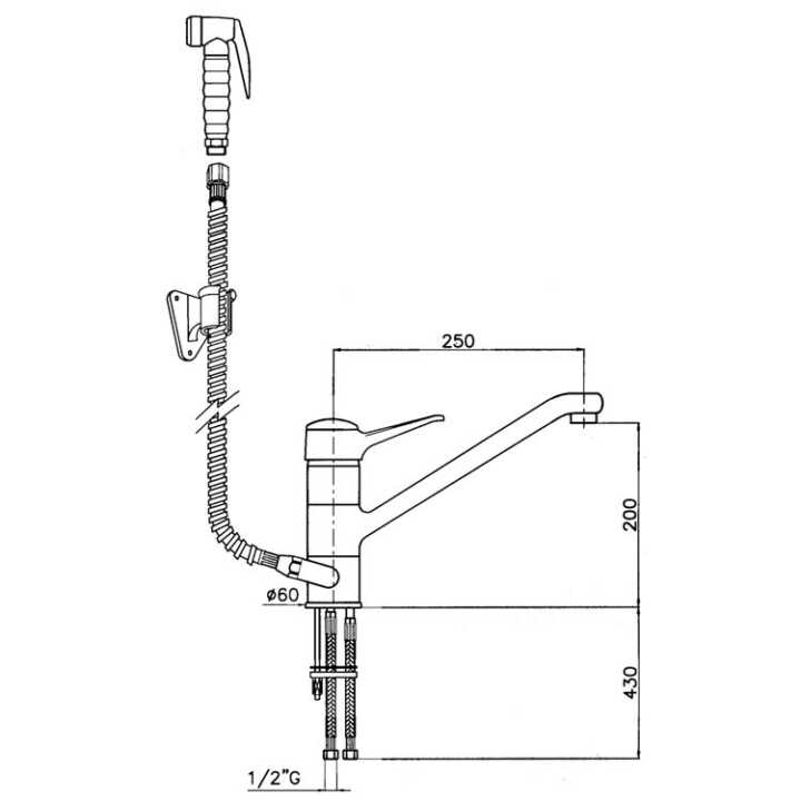 Descrição: Torneira monocomando 2 águas com chuveiro e suporte de parede. Comprimento flexível 1.000 mm.