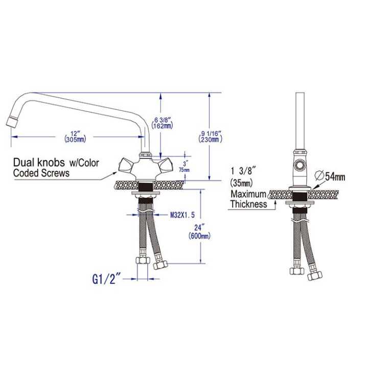 Descrição: Torneira monobloco de 2 águas e botões triangulares. Bica giratória Ø 20 mm, comprimento 300 mm