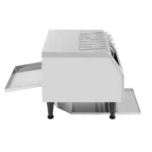 – Tapete transportador em aço inoxidável com velocidade regulável.
