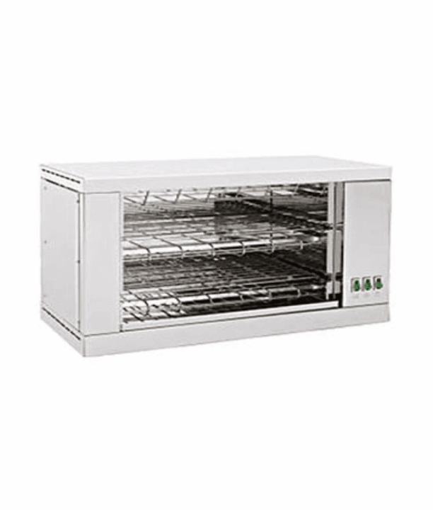 Torradeira elétrica com 2 níveis, sem temporizador, com 9 resistências de quartzo, gaveta de migalhas e 3 interruptores.