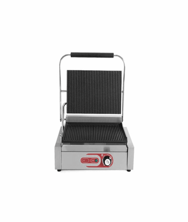 Tostadeira elétrica simples de contacto, com grelha inferior e superior nervuradas, estrutura em aço inoxidável. Dotada com botão on-off e termostato de temperatura.