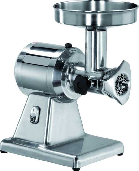 Corpo de alumínio polido com tremonha de aço inoxidável – unidade de moagem de aço inoxidável totalmente removível – Entrada de carne diam.52mm – motor de engrenagem oleada – sistema de entrada com placa de aço inoxidável (furos de diam.6mm) e faca auto-afiada de aço inoxidável fornecida.