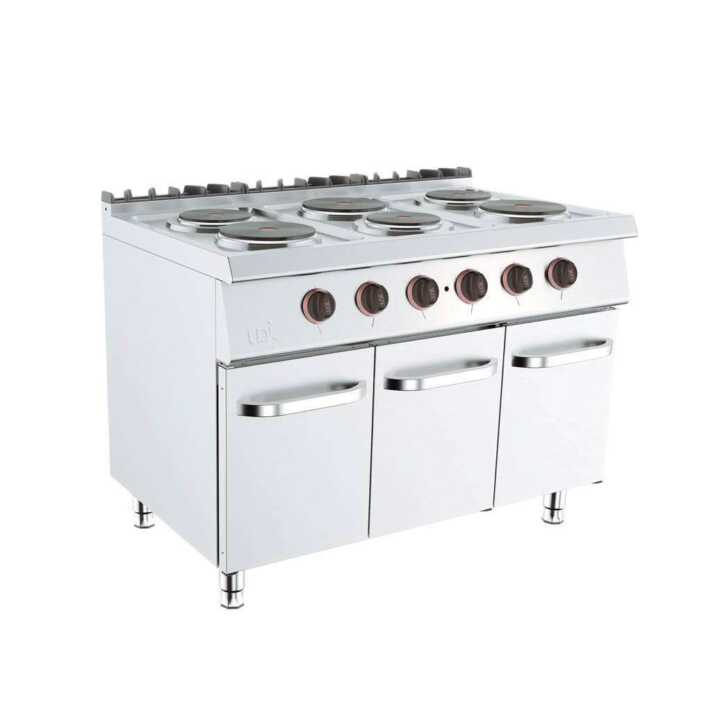 6 placas de aquecimento 2 tipos de placa com aproximadamente Ø 180 e Ø 230 mm Chaminé de ferro fundido esmaltado à prova de riscos Armário inferior Luzes de aviso liga/desliga ao atingir a temperatura desejada Porta isolante com parede dupla de aço inoxidável Resistência cilíndrica inoxidável Controle ajustável de temperatura termostático Luzes de aviso ao atingir a temperatura desejada.