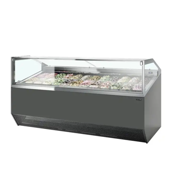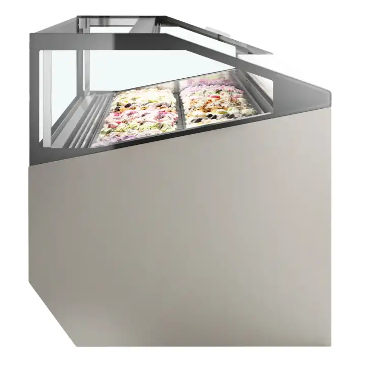 Com grandes painéis de vidro e iluminação LED, ideal para a apresentação de gelados. O ecrã inclinado a 11° optimiza a vista, enquanto o arrefecimento de fluxo duplo de ar assegura uma distribuição uniforme da temperatura. O vidro aquecido evita a condensação, enquanto o vidro frontal articulado permite uma limpeza fácil.