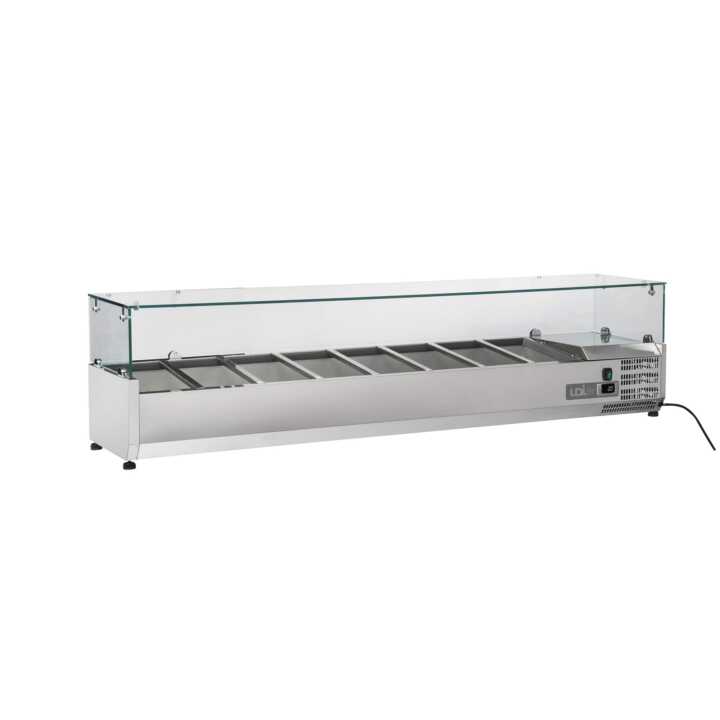 Vitrine de balcão com termostato digital e novo algoritmo de enconomia, vidro temperado, exterior e interior em aço inoxidável, evaporador de cobre de um tubo, sem soldagem, pés ajustáveis.