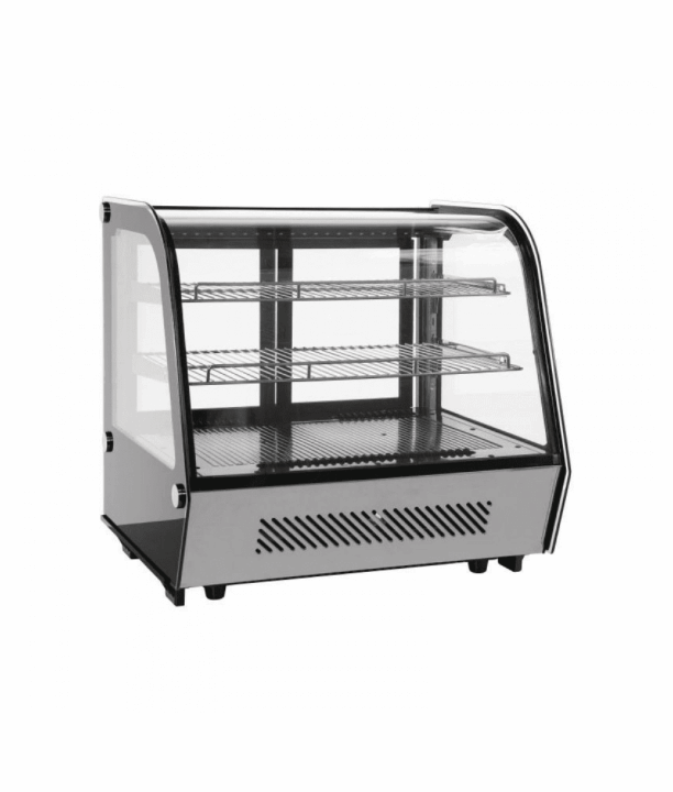 Vitrine expositora de bancada com máxima exposição em espaços reduzidos, iluminação LED interior na zona superior, vidro curvo, controlador digital de temperatura (0ºC a +10ºC) e 2 prateleiras cromadas ajustáveis em altura.