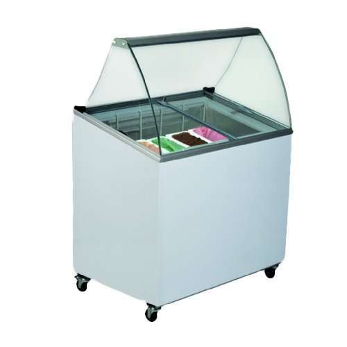 Vitrine expositora para gelado; Com vidros curvos; Com 4 rodas; Inclui 5 covetes em policarbonato;
