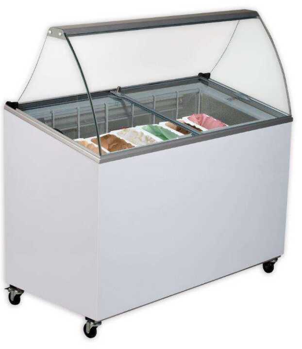 Vitrine expositora para gelado, com vidros curvos, com 4 rodas para facilitar a mobilidade, inclui 7 covetes em policarbonato;