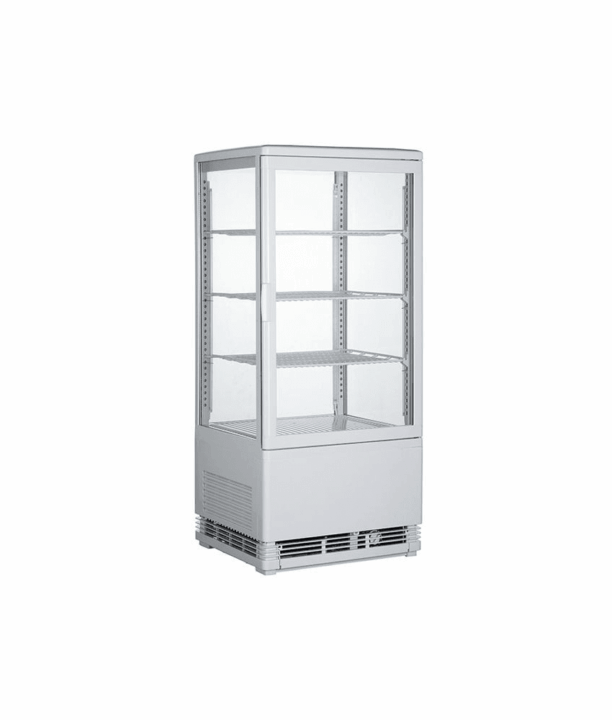 Vitrine refrigerada expositora com 4 faces em vidro, a solução ideal para exposição de saladas, sobremesas e alimentos frescos.