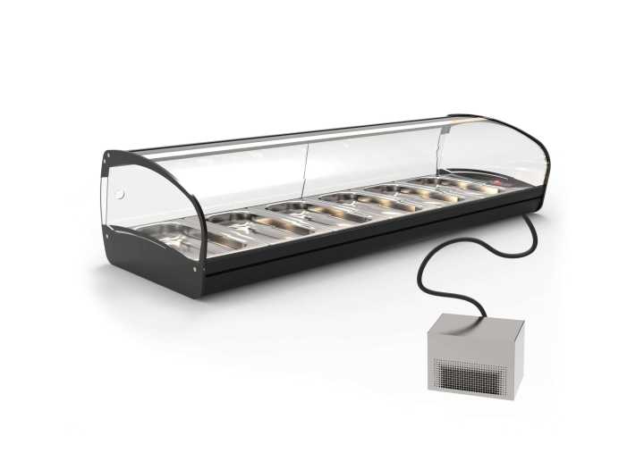 A vitrine define-se como uma vitrine elegante, graças ao seu design original e dinâmico, desenhada para evitar a expulsão de ar quente para o utilizador ou cliente.