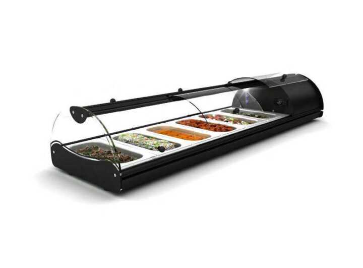 Vitrina especial com portas dianteiras e traseiras dobráveis para facilitar a função de self-service.