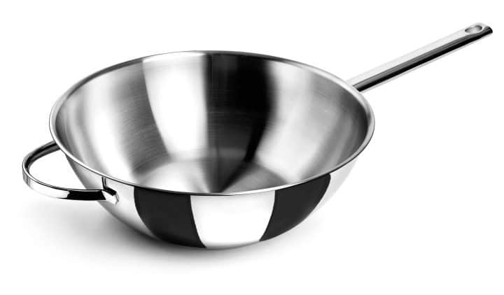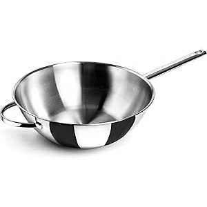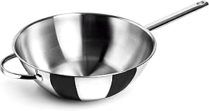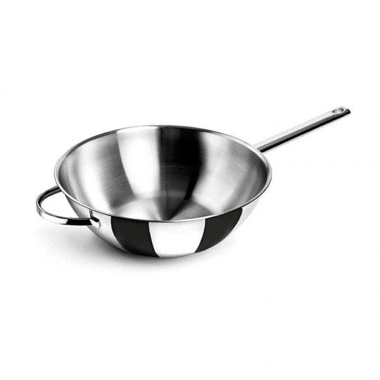 Wok modelo Belly fabricado em aço inoxidável 18/10 com fundo termodifusor sanduíche adequado para placas de indução, elétricos, placas e fogões a gás.